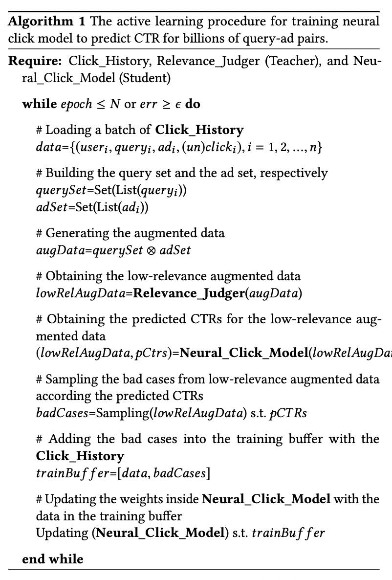 在传统的CTR模型中,模型只需要根据用户的搜索query为其找到最有可能点击的广告即可,所以可能出现序非常靠前的广告和搜索qeury的相关性不高的badcase,同时CTR模型训练所需的日志数据相对于召回层需要处理的数据量级是非常有限的,而且召回层可能需要面对更多的长尾稀疏的query和广告,所以为了解决上述的一系列问题,文章提出了一种基于active- learning的“teacher-student”模型训练框架。