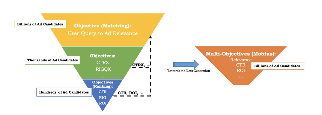 在大部分公司的商业广告系统架构中,都会采用经典的“漏斗”结构,即召回——粗排——精排——重排序等模块,在现有的召回模块中,应该首先保证召回内容的相关性,保证用户的搜索query和候选广告之间的匹配程度,最为基础的召回链路就是要保证召回层的相关性,但是相关性高的广告并不一定具有很高的商业价值,所以开始尝试将一些商业化业务指标作为召回的依据,比如CPM ( 可以理解为变现能力 )。但是如果单纯的依靠CPM来进行召回的话又无法保证召回的准确性,会出现大量的badcase,即“所答非所问”,这种情况对于用户的体验来说是非常不友好的,所以召回层基本都是在保证相关性的大前提下尽量的筛选出一些变现能力较强的候选广告进入排序阶段。