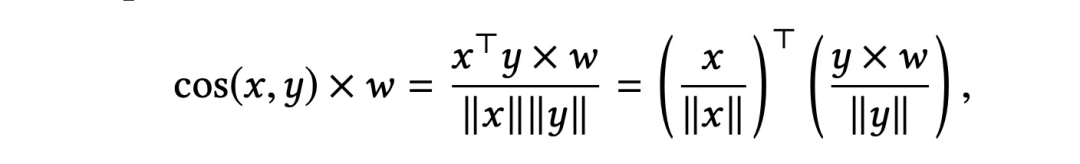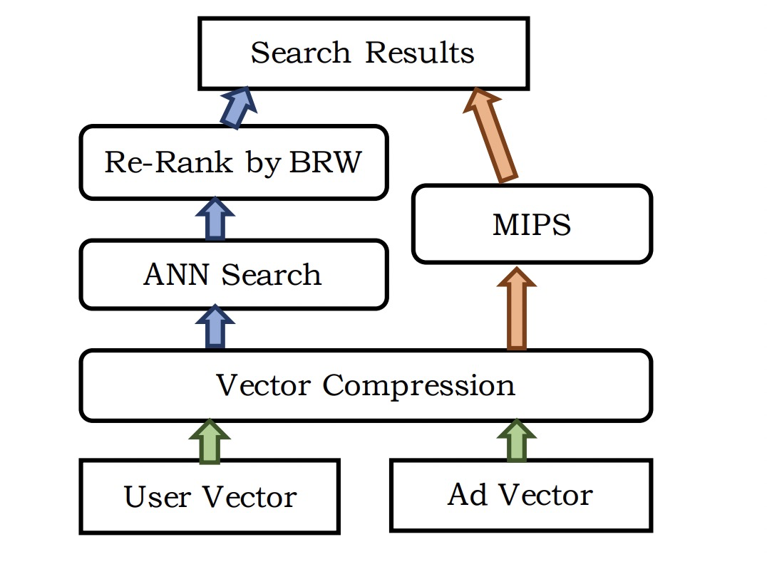 在线上进行广告检索召回的时候,当收到一个用户请求 ( query ) 时,线上计算可以得到用户的query embedding,利用query embedding需要在保证相关性的前提下筛选出变现能力最高的一批候选广告,这时就需要利用query embedding去进行检索,暴力的全库检索基本是不可实现的 ( 线上计算开销太大,根本无法满足耗时的要求 ),所以比较常用的是近似最近邻 ( ANN ) 检索 ( 开源库比较多,例如ANNOY,FAISS,HNSW等 ),ANN检索通常是根据余弦相似度来进行计算的,在ANN检索之后对检索的结果进行相应商业指标权重来进行重排序得到检索结果。除此之外文章还提到了最大内积检索 ( MIPS ),上述提到的检索方式是先检索再根据业务指标排序,MIPS则是将业务指标改写进了相似度计算的公式中,也就是在检索的过程中是考虑了商业指标的,具体计算公式如下: