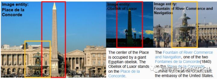 因为很难基于不同图像的像素特征直接检测出这些语义关系,所以我们利用基于规则的关系抽取模板,借助Wikipedia图像描述中的超链接信息,生成图像实体间的多模态语义关系。在图6中,我们以rpo:contain和rpo:nearBy为例说明如何发现协和广场,卢克索方尖碑和航运喷泉图像实体间的语义关系。如图6所示,我们在中文维基百科中协和广场词条中获取到包含卢克索方尖碑和航运喷泉的图像实体,从语义视觉关系的角度上看,协和广场包括了卢克索方尖碑和航运喷泉,卢克索方尖碑就在航运喷泉的旁边。为了发现这些关系,我们收集这些图像的文本描述,并提出三个有效的规则来提取多模态语义关系: