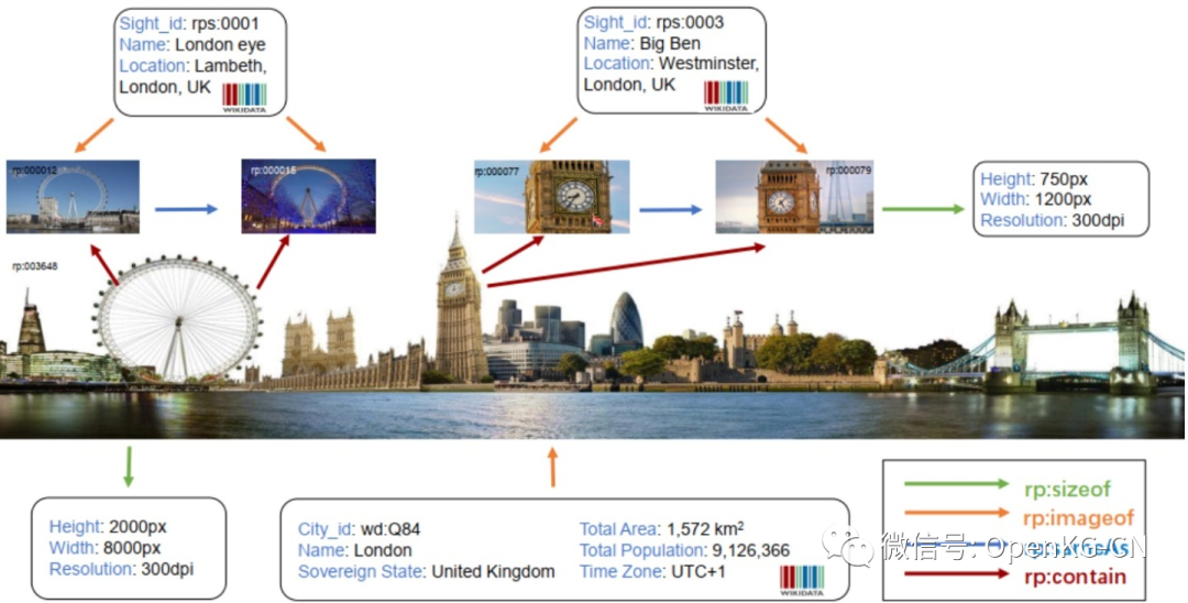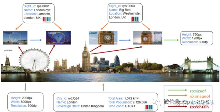 多模态知识图谱与传统知识图谱的主要区别是,传统知识图谱主要集中研究文本和数据库的实体和关系,而多模态知识图谱则在传统知识图谱的基础上,构建了多种模态(例如视觉模态)下的实体,以及多种模态实体间的多模态语义关系。例如在最新的一个多模态百科图谱Richpedia中(如下图2所示)[5],首先构建了图像模态伦敦眼图像与文本模态知识图谱实体(DBpedia实体:London eye)之间的多模态语义关系(rpo:imageof),之后还构建了图像模态实体伦敦眼与图像模态实体大本钟之间的多模态语义关系(rpo:nextTo)。