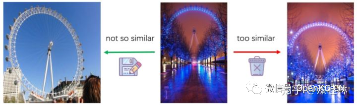 在收集完图像实体之后,我们需要对图像实体进行预处理和筛选。因为我们的数据来自于开放资源,它们会被搜索引擎基于与查询字段的相关性评分进行排名。从多模态知识图谱的角度而言,文本知识图谱实体所包含的图像实体不仅要相关性高而且还要具有多样性,如图5所示,对于中间的图像实体,右侧的图像实体因为较高的相似性从而被系统过滤掉,保留左侧相似性较低的图像实体。因为从搜索引擎中获取的图像实体难免存在重复问题,接下来我们通过一系列的预处理操作,使得每个图像实体都与相应的传统文本实体具有较高的相关度。其中预处理操作包括去噪操作和多样性检测,去噪操作的目的是去除不相关的图像实体,多样性检测的目的是使得图像实体具有尽可能高的多样性。