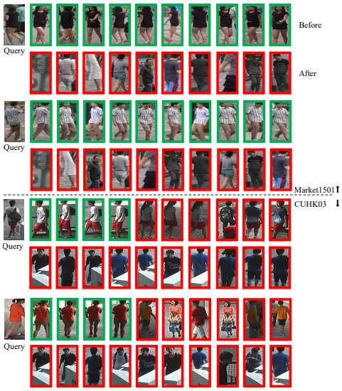 Market-1501 和 CUHK03 上 AlignedReID 被攻击前后的 Rank-10 结果。绿色代表正确匹配。红色代表错误匹配。