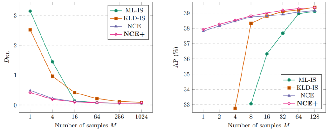 图左:用于 1D 回归实验的四种表现最佳方法的详细比较;图右:COCO-2017 Val 数据集上,用于目标检测实验的四种表现最佳方法的详细比较。四种方法均分别为 ML-IS、KLD-IS、NCE 和本研究提出的 NCE+。