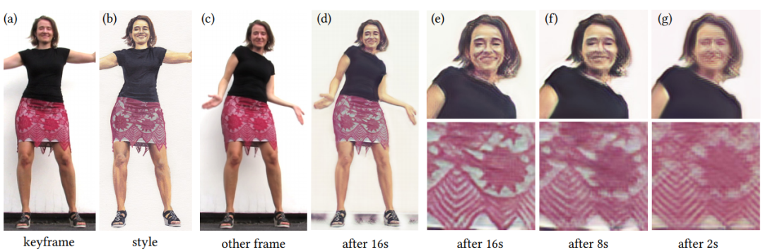 此外,这种学习方法还可以合并多个关键帧中的内容,同时不需要执行显式混合操作。研究者验证了这种学习方法在各种交互场景中的实用性,在这些场景中,用户在选定关键帧中绘画,并且绘画风格可以迁移至已有的记录序列或实时视频流中。