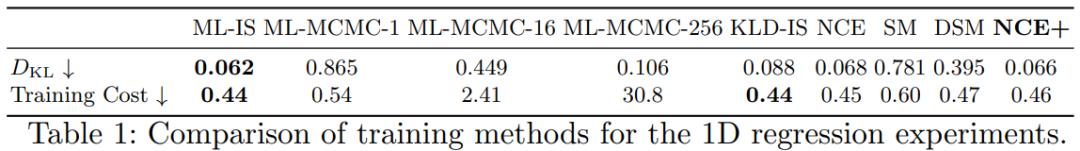 1D 回归实验训练方法的 D_KL 和训练成本对比。