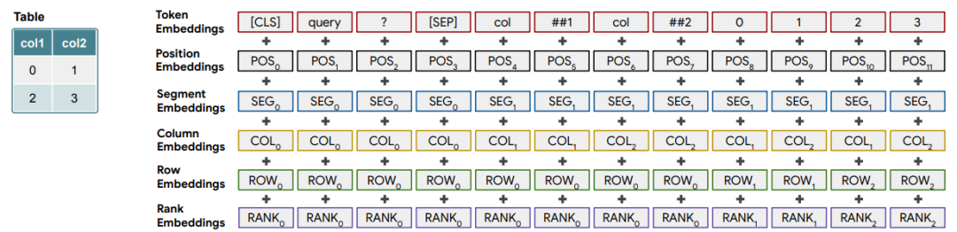 问题 “查询(query)” 的编码以及使用 Tapas 特定嵌入的简单表格。