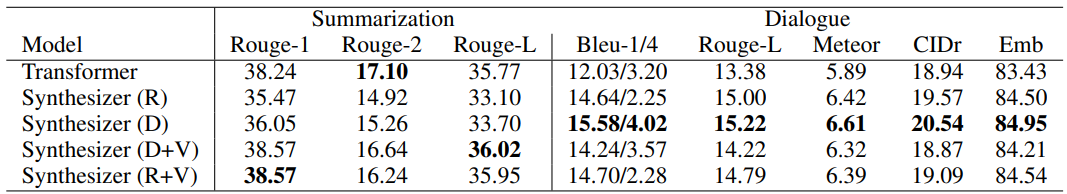 本研究提出的 Synthesizer 在 MT、语言建模、摘要式归纳、对话生成以及多任务语言理解等一系列任务上的性能