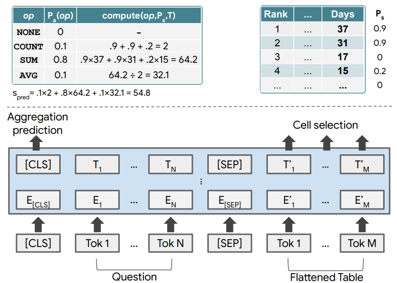 本研究提出的 Tapas 模型以及对于问题 “排名前二的总天数(total number of days for the top two)” 的示例模型输出。