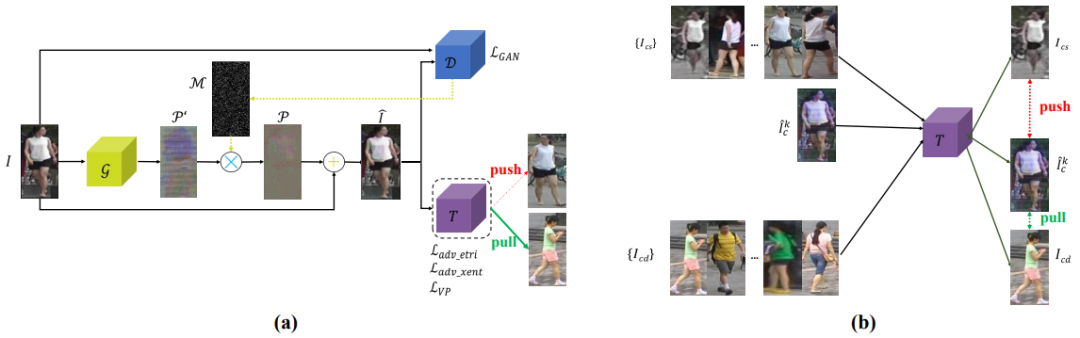 由于跨数据集的可迁移性在 re-ID 域中至关重要,因此作者还通过构建新颖的多级网络体系结构进行半黑盒式攻击,该体系结构将不同级别的特征金字塔化,以提取对抗性扰动的一般和可迁移特征。该体系可以通过使用可微分的采样来控制待攻击像素的数量。为了保证攻击的不显眼性,研究者还提出了一种新的感知损失,以实现更好的视觉质量。