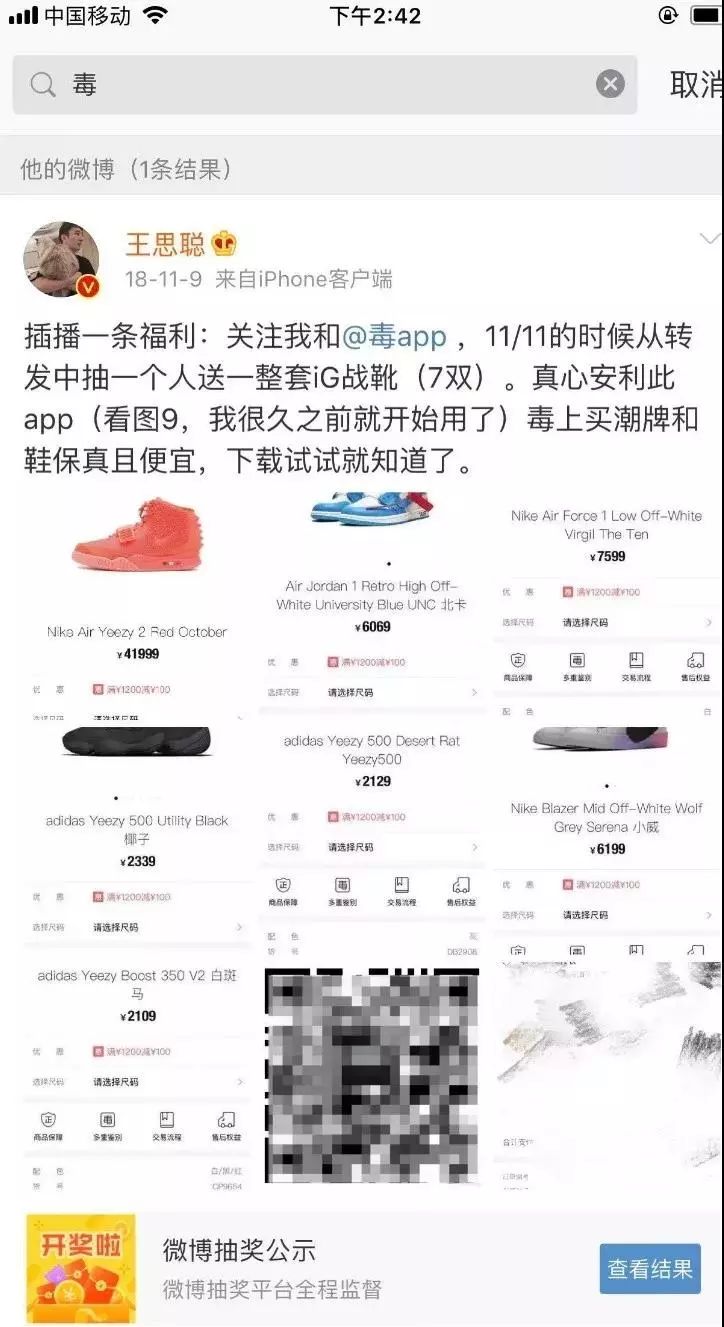 “毒APP”出自于直男属性极强的体育社区虎扑,笼络了一批热爱体育装备的垂直人群,但更多圈外人知道它,是因为王思聪多次在微博上安利,称“此APP上买潮牌和鞋保真且便宜”。