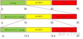 若每个区间的宽度都是固定的,那么只能处理离散的年龄,第三层级的“分辨率”只能是3.3,而且把年龄分段计算,会有明显边界效应。