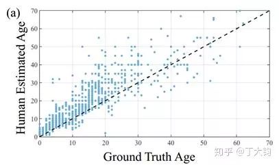 使用算法进行年龄估计是一个比较困难的任务,人脸年龄与头骨形状、五官位置、皱纹等都有一定关系,而且会受到光照、姿态、表情等的影响【1】。据下图所示,即使是人类对年龄的观察估计也会有很大偏差【2】。