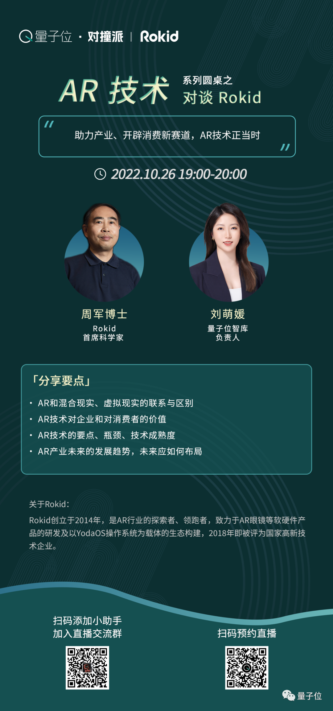 10月26日晚19:00,“AR/MR技术”系列对谈节目第1期「量子位·对撞派」邀请到了AR技术领域的先行者——Rokid,将由Rokid的首席科学家周军博士为我们分享~