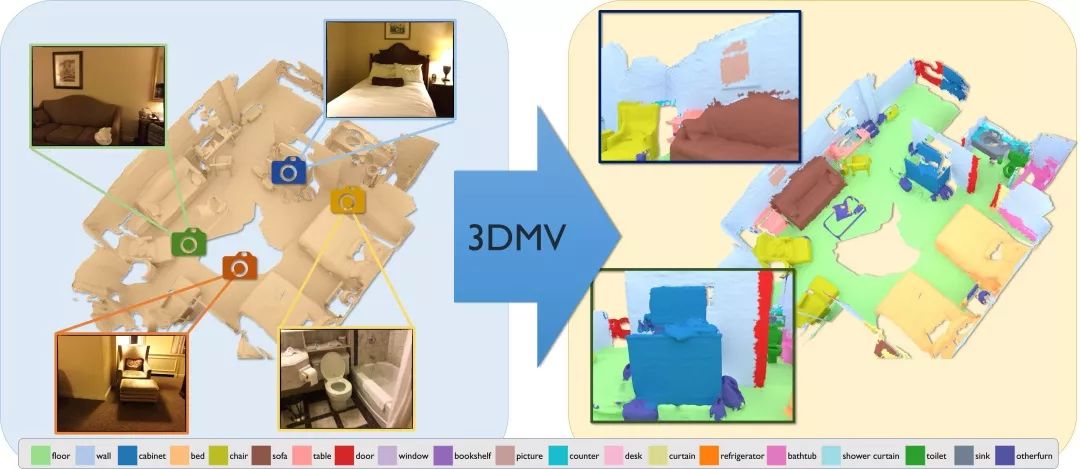 图1 3DMV(三维多视图)以RGB-D扫描及其彩色图像(左)的重建作为输入,并以每个体素标签(映射到网格,右)的形式预测3D语义分割。我们的方法的核心是利用几何特征和颜色特征之间的协同作用的联合3D-多视图预测网络。