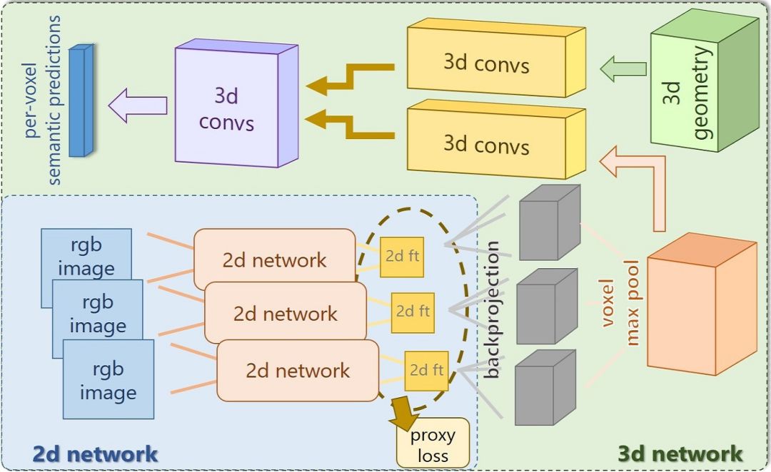 图2 网络概述:我们的架构由2D和3D两部分组成。2D侧将多个对齐的RGB图像作为输入,从这些特征中学习具有代理丢失的特征。这些使用可微反投影层映射到3D空间。将每个体素中从多个视图提取的特征通过最大池化进行汇集,并馈送到3D卷积流中。同时,我们将3D几何输入到另一个3D卷积流中。然后,连接两个3D流,并且预测每个三维体素的标签。整个网络以端到端的方式进行训练。
