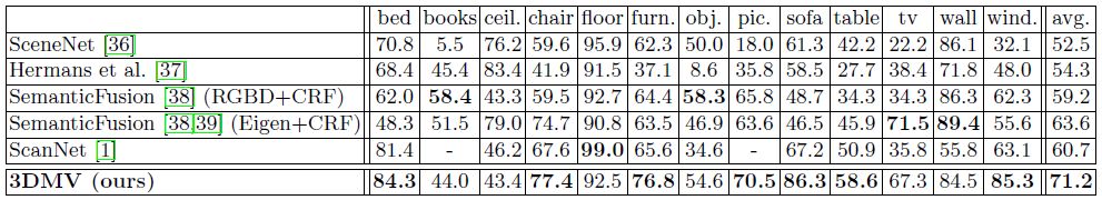 表6 我们通过将预测的3D标签投影到相应的RGB-D帧来评估我们的方法在2D语义分割任务上的性能。这里,我们对在NYU2上的密集像素分类精度进行了比较。注意,表中ScanNet分类是11类分类任务的精度统计结果。