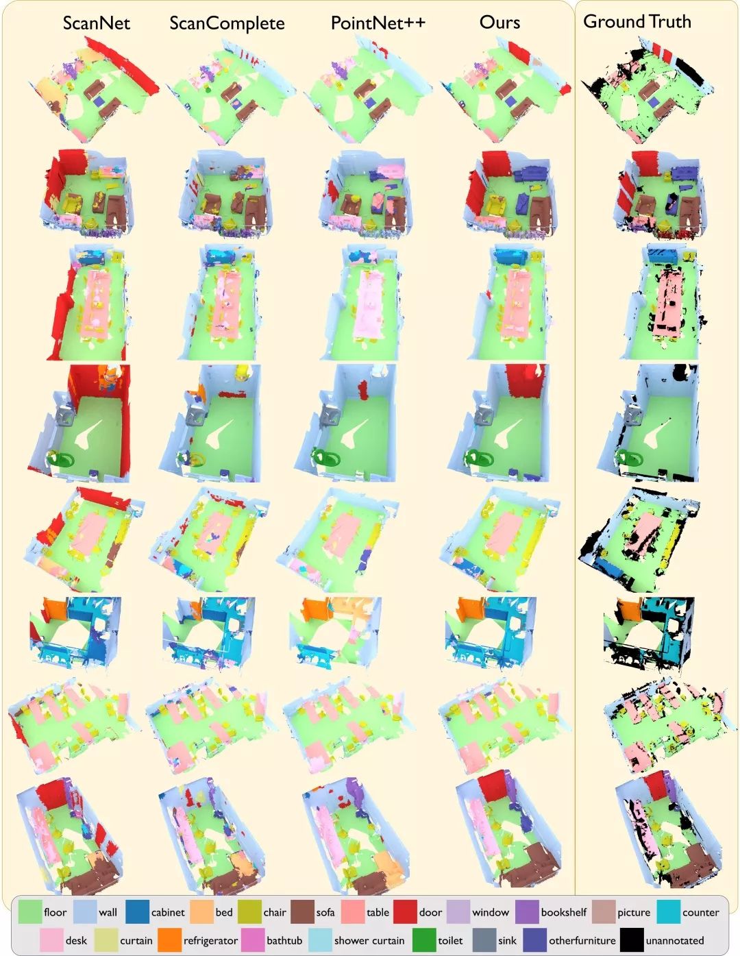 图3 在ScanNet测试集上的定性语义分割结果。我们对比了基于3D的ScanNet、ScanComplete、PointNet+++的方法。注意,参考标准场景中包含一些未标注区域,用黑色表示。我们的联合3D多视图方法实现更准确的语义预测。