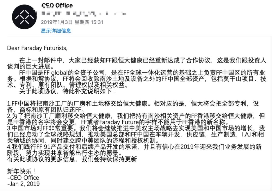 FF发出内部邮件,并公布了“FF中国分家方案”。FF内部邮件称,FF总部将获得除广州南沙项目相关资产之外的FF中国全部资产、技术、员工、管理权以及相关权益;广州南沙工厂划归恒大。恒大方面尚未回复。FF还在内部邮件中表示,FF为把南沙项目顺利移交给恒大健康,会把持有南沙相关资产的FF香港移交给恒大健康,但是FF香港的名字将会变更。