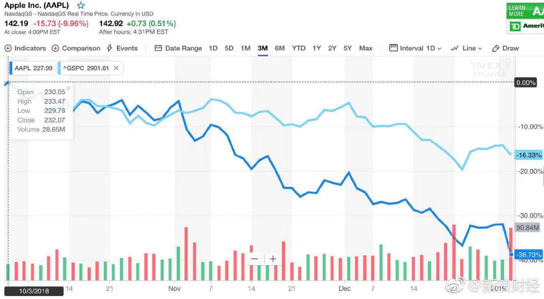 1月3日美股收盘,苹果收跌9.96%,创2017年4月21日以来收盘新低,市值6747.4842亿美元。至1月3日美股收盘,美国市值超千亿美元的主要科技公司依次为微软(7476.64亿美元)、亚马逊(7335.90亿美元)、谷歌母公司Alphabet(7129.57亿美元)、苹果、Facebook(3791.39亿美元)、以及奈飞(1183.45亿美元)。自去年苹果股价上升至最高点以来,三个月里市值已缩水逾4200亿美元。而作为苹果第二大股东的巴菲特旗下伯克希尔-哈撒韦公司一夜之间损失超过30亿美元。