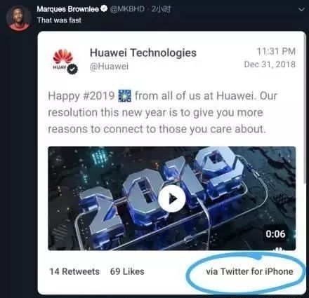 华为关于官方推特账号出现事故的问责决定文件在网上流出。文件称,该推文发布后,截图在部分海外和国内社交媒体上广泛传播,对品牌带来了不良影响;决定对直接责任人予以通报批评,个人职级降1级,月薪下调5000元。2018年12月31日,华为官方推特送新年祝福,推文下方却留下了“自推特的iPhone客户端发出”,该文随后被删。