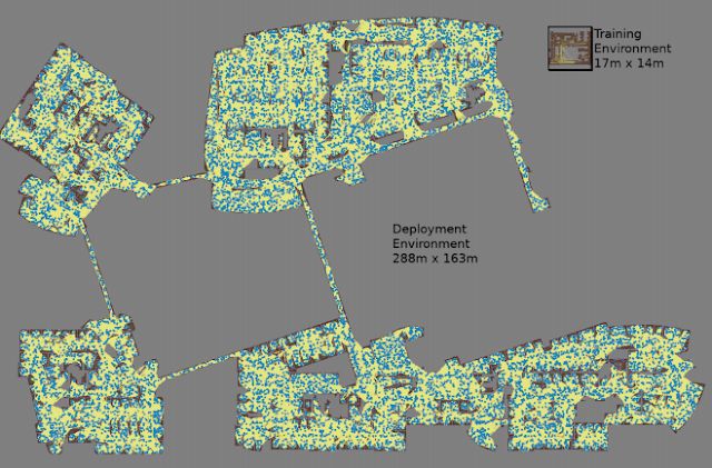 论文展示了可以把强化学习和长距离规划结合在一起,让机器人更高效地在复杂环境中导航(下图中的例子是谷歌的办公楼)