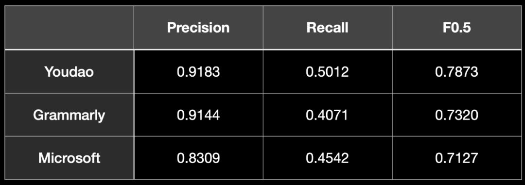 其中,Precision 是语法检测与修正的精确率,Recall 表示语法检测与修正的召回率。而 F0.5 为精度与召回率的调和平均,其值越高,通常表示算法性能越好。