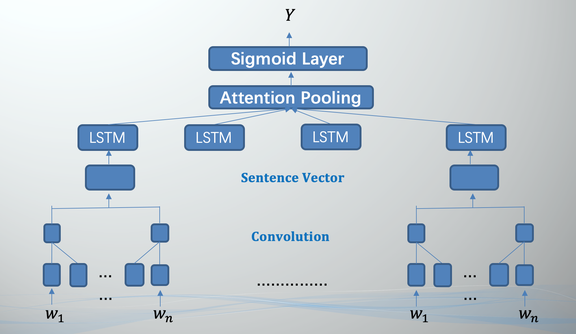 如下是有道打分模型的主要框架,其中 w_i 都是某个句子的「单词」,每一条句子会通过卷积神经网络编码为一个「句子语义向量」。这些语义向量最终会通过循环神经网络与注意力机制编码为一个作文的整体分数。