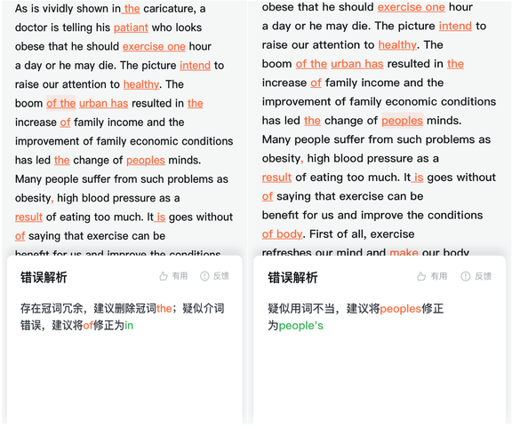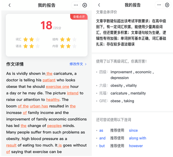 如下左边是雅思作文,它会给作文整体打一个分数,并通过点评告诉你哪些地方需要加强,例如词汇的丰富度、逻辑的连贯性等等。对于我们比较关心的语法,AI 作文批改也会给出修改意见,例如「environment」就推荐改成「environmental」。