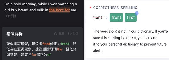 我们可以先通过一条相同的错句试试不同语法纠错产品的效果:「On a cold morning, while I was watching a girl buy bread and milk in the fiont for me.」。
