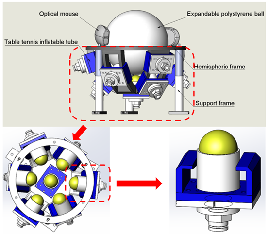 虚拟运动单元采用吹气式悬浮装置和光电定位技术,通过空气调节装置给充气管充气使乒乓球托起悬浮的泡沫球。动物身体以泡沫球作为支撑,可以在泡沫球上自由跑动。光电定位装置实时监测泡沫球滚动的方向和速度,经过计算分析转换为动物在虚拟空间中的位置信息及运动状态,同时实时更新虚拟视觉装置上显示的图像,从而实现啮齿动物的运动状态与虚拟视觉场景之间的实时交互。