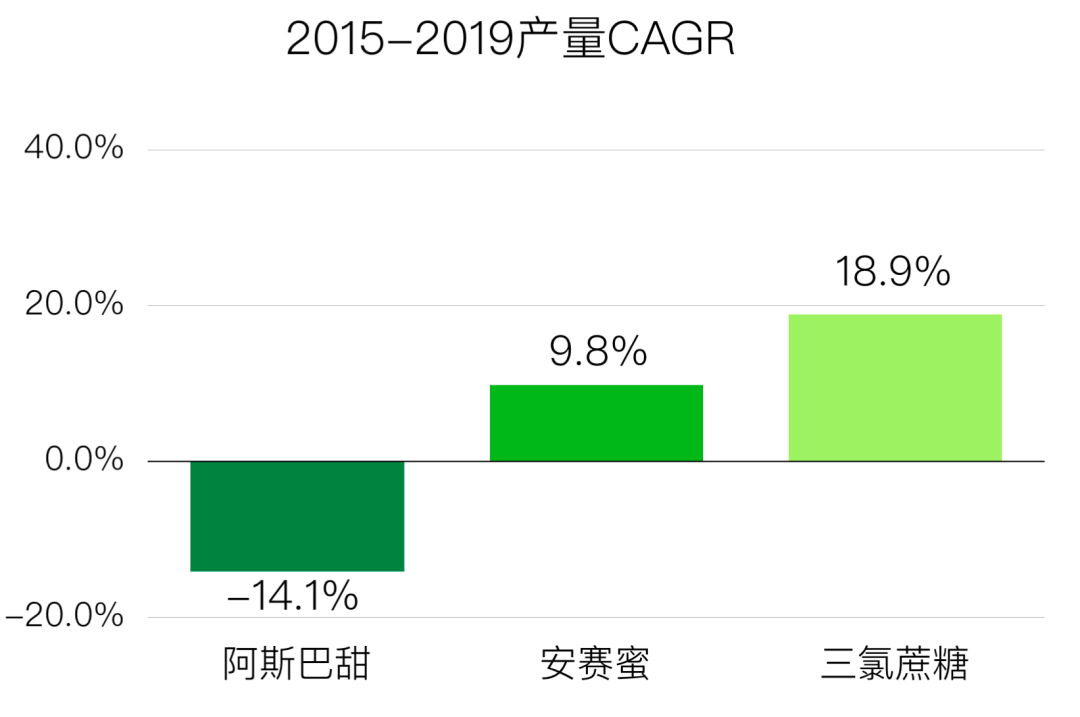 阿斯巴甜依然在全球代糖市场份额占比两成左右,但因为代谢产物已被证明对人体有一定危害,近5年的复合增速保持在接近于-15%。目前安赛蜜和三氯蔗糖在因为相对安全而在高速增长,近5年的复合增速保持在接近20%和10%。由于单价原因,三氯蔗糖的产值显著高, 目前已经超过了上一代王者阿斯巴甜,成为了产值第一。