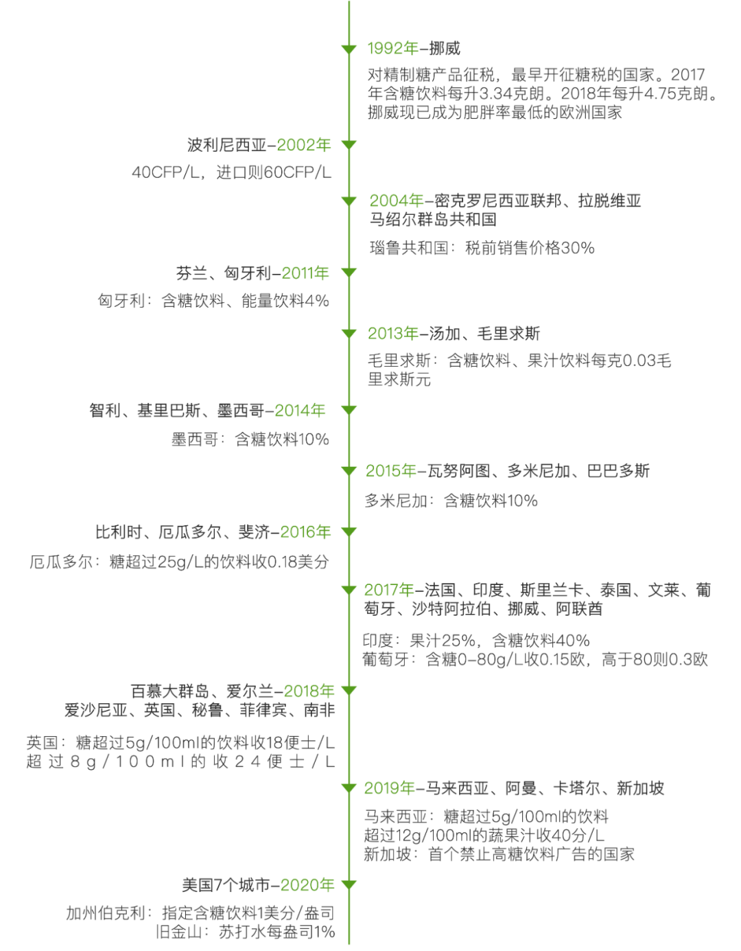 世界卫生组织自2016年起,多次呼吁各国政府对含糖饮料至少征收20%的特别税。目前全球有50个左右的国家征收糖税。糖税增加的公共收入可以直接用于健康或医疗支出,主要是解决糖尿病、肥胖和龋齿。在此政策趋势引导下,寻找能给人类带来甜味感官但又没有糖的害处的甜味剂来替代糖,成为了全球食品企业共同的目标。企业在糖税的刺激下,通过对上游科研的支持、中游生产的投入和对下游消费者的教育,客观上实现了代糖产业的高速发展。