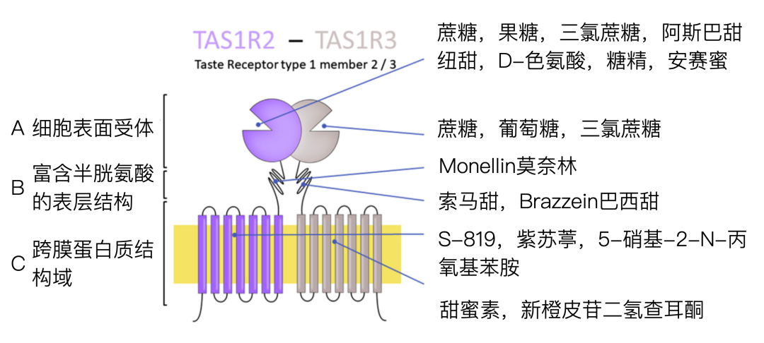 研究表明,TAS1R2/3受体的结构是一个包含正构结合位点的细胞表面受体结构域(A)和一个七螺旋跨膜蛋白质结构域(B),这两个构域由结构上受分子内二硫键约束的富含半胱氨酸的表层结构域(C)连接,如图所示。甜味受体激活的机制是正构配体结合涉及TAS1R2和TAS1R3细胞外结构域的闭合和旋转,然后化学刺激通过富含半胱氨酸的结构域传递到下游信号效应器结合的跨膜结构域。跨膜结构域拥有一个变构结合位点,富含半胱氨酸的结构域则可以结合甜味蛋白。