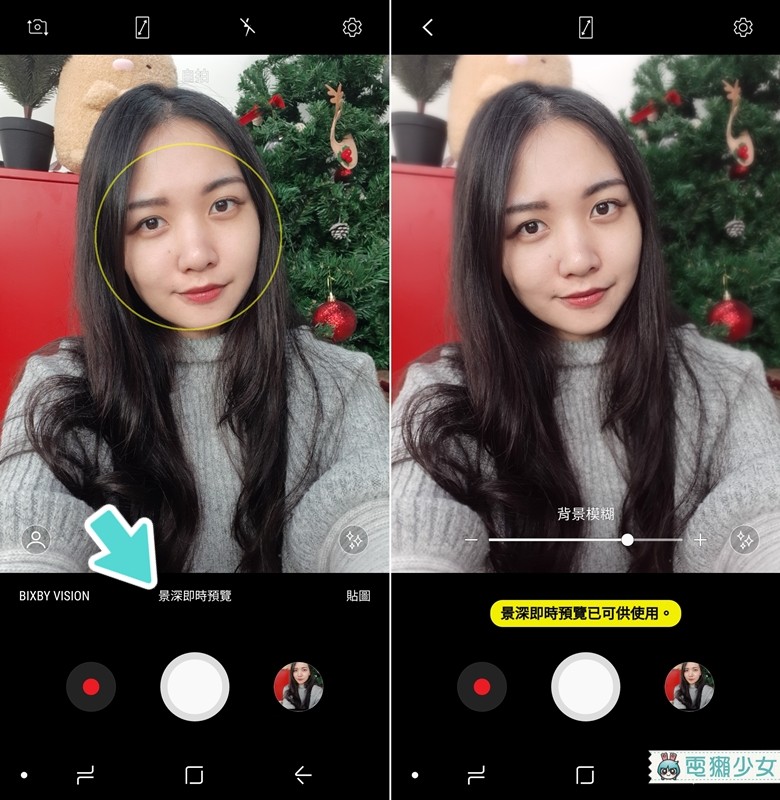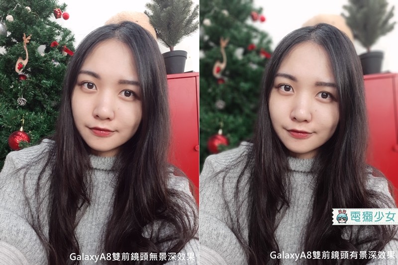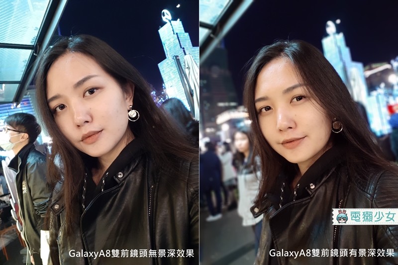 Galaxy A8 的双前镜头是长焦+广角镜头的搭配,不只可以製造景深效果,还可即时预览跟调整景深效果,这边对比一下景深给你看(路人掰掰~杂物掰掰~