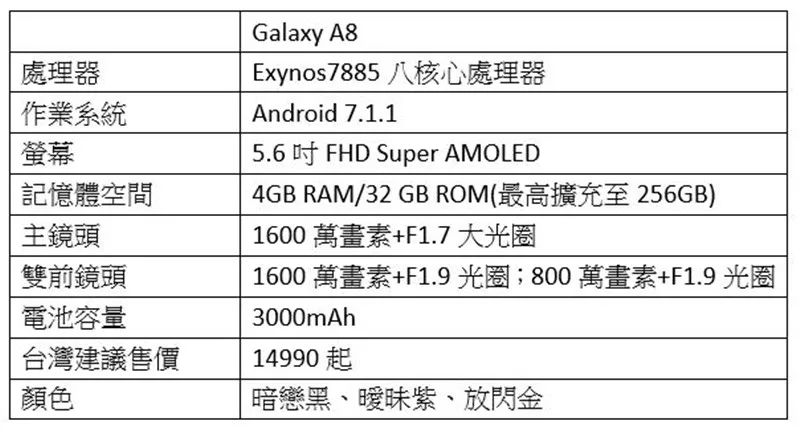 Galaxy A8 边框是金属边框,它可双卡双待,在上方处可置放一张 SIM 卡、一张 micro SD 卡,最高可扩充到 256GB