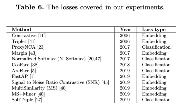 研究者选择了近年来多个会议论文在度量学习领域提出的先进方法(如表 6 所示),在 11 种损失和一种损失+miner 组合上进行实验。