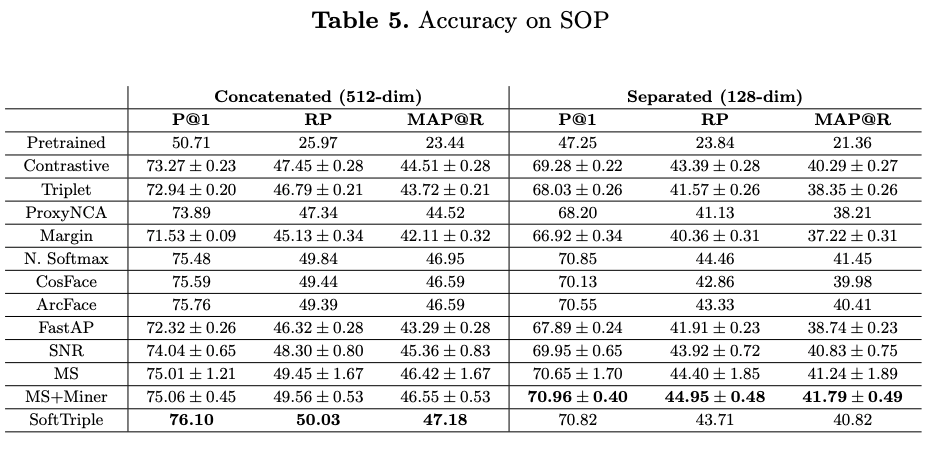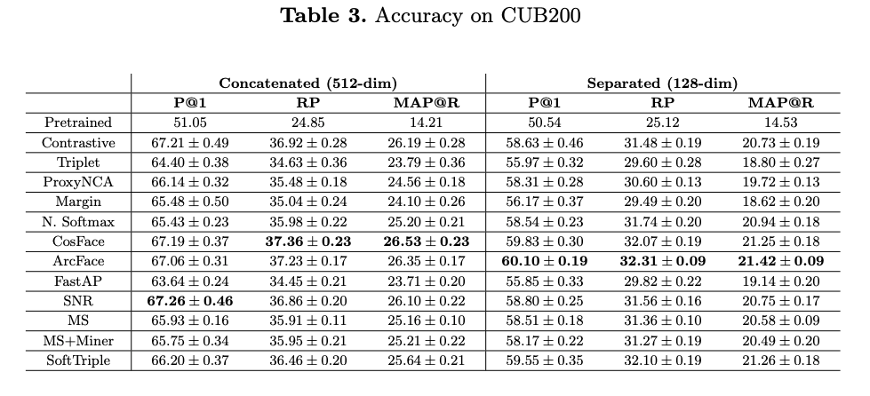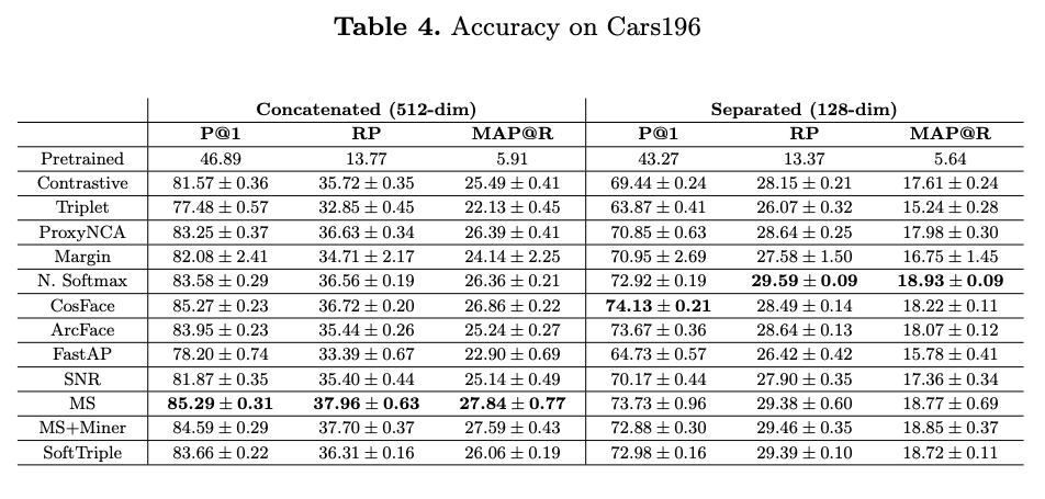 研究者选用了 3 个度量学习领域广泛使用的数据集:CUB200、Cars196 和 Stanford Online Products (SOP),选择这 3 个数据集也便于和之前的论文做比较。表 3-5 展示了训练运行的平均准确率,以及在适用时 95% 的置信区间,加粗部分代表了最好的平均准确率。同时也包括了预训练模型的准确率,用 PCA 将模型的嵌入值减少到 512 或 128。