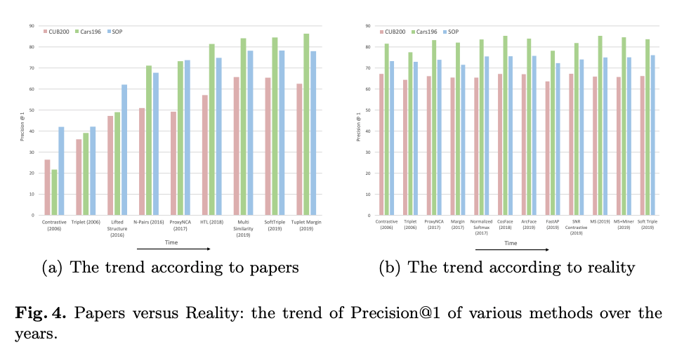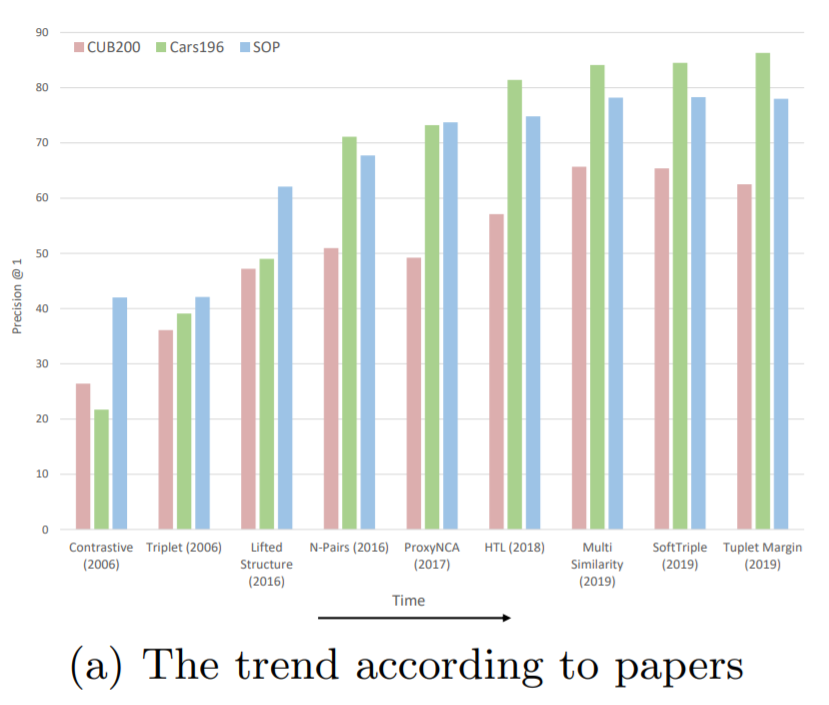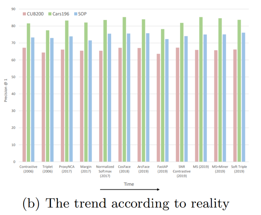 通过这些基线损失所呈现的良好实现、公平竞争环境和机器学习实践,研究者获得了如图 4(b) 所示的趋势图——事实上它似乎是平滑的走向。这表明无论是在 2006 年还是在 2019 年,各种方法的性能都是相似的。换句话说,度量学习算法并没有取得论文中所说的那么夸张的进展,论文中没有提到的前沿论文也值得怀疑。