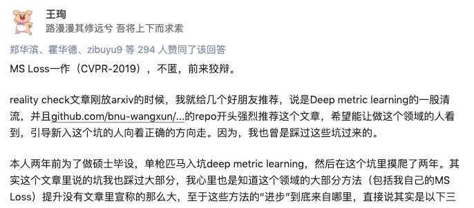 也有深度度量学习领域研究者、CVPR 2019 论文一作前来回答,并将这篇论文放在了自身研究介绍项目的开篇,希望「能让做这个领域的人看到,引导新入这个坑的人向着正确的方向走。因为,我也曾是踩过这些坑过来的」。
