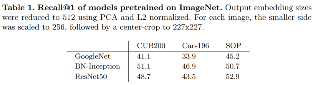 提高准确率最简单的方法之一是优化网络架构,但这些论文却没有保证这项基本参数固定不变。度量学习中架构的选择是非常重要的。在较小的数据集上的初始的准确率会随着所选择的网络而变化。2017 年一篇被广泛引用的论文用到了 ResNet50,然后声称性能得到了巨大的提升。这是值得质疑的,因为他们用的是 GoogleNet 作比较,初始准确率要低得多(见表 1)。