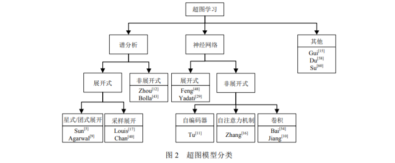 随着图结构化数据挖掘的兴起, 超图作为一种特殊的图结构化数据, 在社交网络分析、图像处理、生物反应解析等领域受到广泛关注. 研究者通过解析超图中的拓扑结构与节点属性等信息, 能够有效解决实际应用场景中所遇到的如兴趣推荐、社群划分等问题. 根据超图学习算法的设计特点, 将其划分为谱分析方法和神经网络方法, 根据方法对超图处理的不同手段, 可进一步划分为展开式方法和非展开式方法. 若将展开式方法用于不可分解超图, 则很有可能会造成信息损失. 然而, 现有的超图相关综述文章鲜有就超图学习方法适用于哪类超图这一问题做出相关归纳. 因此, 分别从超图上的谱分析方法和神经网络方法两方面出发, 对展开式方法和非展开式方法展开讨论, 并结合其算法特性和应用场景作进一步细分; 然后, 分析比较各类算法的设计思路, 结合实验结果总结各类算法的优缺点; 最后, 对超图学习未来可能的研究方向进行了展望.