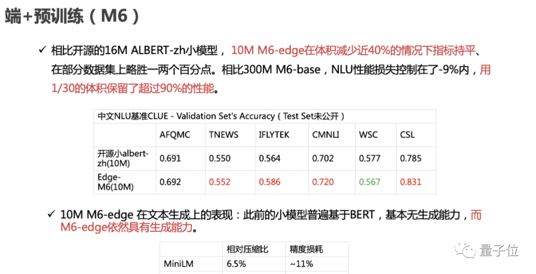 具体而言,压缩后的M6小模型大小仅为10MB,与开源的16M ALBERT-zh小模型相比,体积减少近40%,并且效果更优。难得的是,10MB的M6模型依然具有文本生成能力。