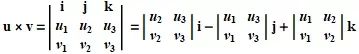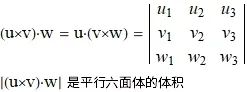 空间两个非零向量 u 和 v. 如果 u 和 v 不平行, 那么就确定了一个平面. 这样可以用右手法则选择一个垂直于这个平面的单位向量 n. |u×v| 是平行四边形的面积.