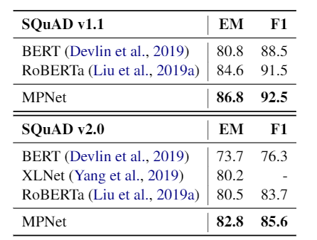 从表5我们还能发现以下几个现象:1)PLM 相比 MLM 的确取得了不错的效果提升;2)PLM 没有完全解决 MLM 的问题,因为从表中可以看到直接在 MLM 中引入预测词之间的依赖(MLM + output dependency)比 PLM 的效果更好;3)PLM 在解决 MLM 的预测词之间依赖问题的同时,丢掉了 MLM 中的句子全局位置信息。因此,MPNet 通过吸收 MLM和 PLM 的优点,规避各自的问题,取得了更高的精度。相比先前的预训练模型 BERT、XLNet 以及 RoBERTa,在相同的模型配置下,MPNet 在对比的数据集上都取了显著的效果提升。