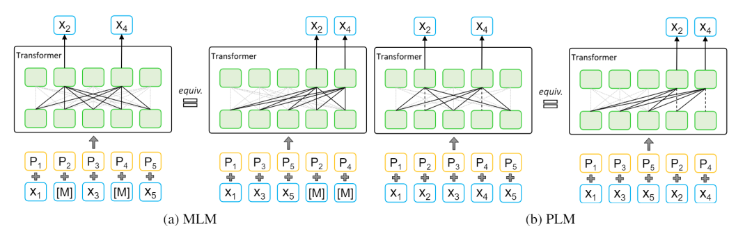 图1:(a) 掩码语言模型 MLM 和 (b) 排列语言模型PLM,(a) 和 (b) 右侧为 MLM 和 PLM 的统一视角。