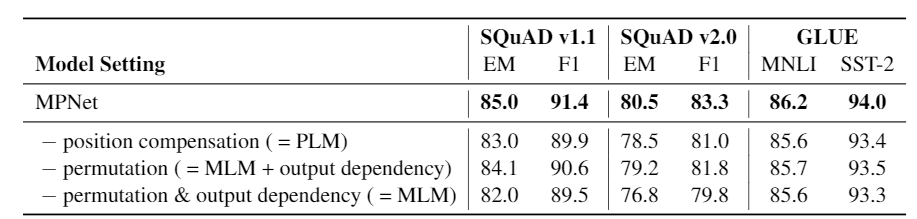 为了能够进一步分析 MPNet 在获取全局位置和建模预测单词之间的依赖关系,以及验证 MPNet 中每个模块设计的有效性,我们做了一系列消融实验来对比分析,如表5所示。我们发现在 MPNet 的基础上去掉位置补偿(position compensation),去掉预测部分的随机排列(permutation)以及进一步去掉预测词之间的依赖关系(output dependency),在 GLUE 和 SQuAD 任务上都会导致明显的模型精度损失,这也验证了 MPNet 在获取全局位置信息和建模预测词之间依赖上的有效性。