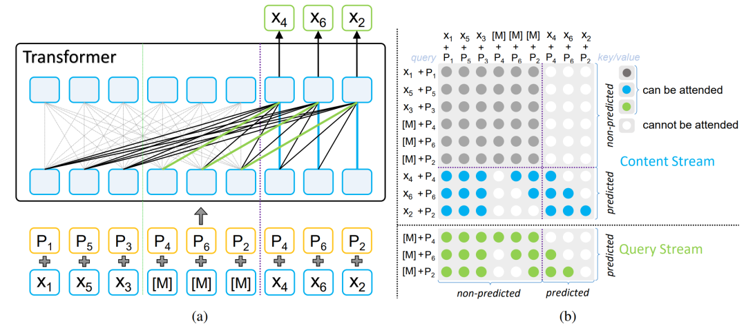 图 2:MPNet,(a) 是 MPNet 的结构图,(b)是 MPNet 中双流注意力机制的掩码示意。