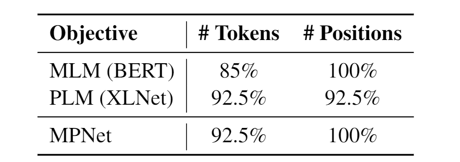 为了分析 MPNet 在设计上的优势,我们首先对比分析不同预训练目标对于输入信息的利用。假设我们预测15%的单词,那么各个目标对单词信息以及位置信息的利用率如表1所示。我们发现 MPNet 在位置利用和单词利用上,结合了MLM 和 PLM 的优点,分别达到了92.5%和100%,高于单独的 MLM 和 PLM。关于信息比例如何计算请参见论文。