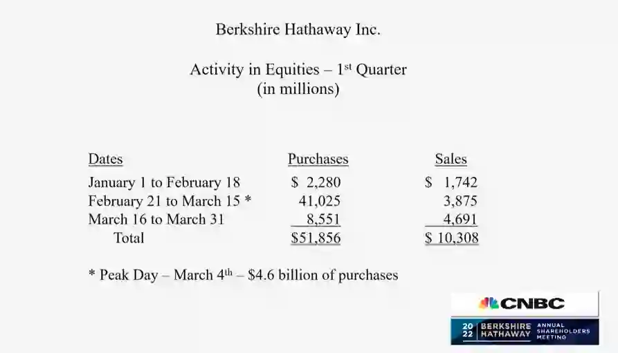 巴菲特列举了一季度股票交易情况。伯克希尔在第一季度市场暴跌期间购买了超过510亿美元的股票。巴菲特在2月股东信中曾表示,市场上“没有什么让我们兴奋”。不久之后开始大笔买入。